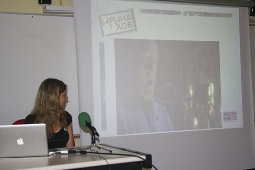 R. Irina Khov es un personaje complejo que nos ha servido a nosotros como excusa para crear este grupo. Irina Khov es una artista que perteneció a la vanguardia rusa del constructivismo y nos gustaba la idea por varias razones. En primer lugar porque Irina Khov representa casi todo lo que puede significar una vanguardia artística en el sentido de transformación de la vida, de pensar el presente y en el sentido de integrar múltiples disciplinas, que yo creo que en el fondo es un poco el espíritu que quiere tener esta nueva Facultad, la Facultad de Artes y Comunicación. Por otra parte es una figura olvidada, casi nadie la conoce, nadie sabe de esta mujer, ha sido eclipsada por otras figuras claves del constructivismo con lo cual la cuestión del género de muchas mujeres que han sido olvidadas por la historia también nos servía. Pero básicamente para nosotros Irina Khov es una especie de juego o de artificio textual, de metáfora de lo que quiere representar nuestro grupo.